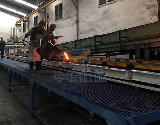 1、全自動造型機打出來砂型直接在鏈板線上循環(huán)輸送,可以是單排雙列,也可以雙排雙列;